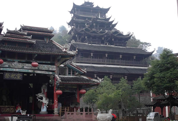 九重天 九重天世襲堂是土家風(fēng)情園的精華和靈魂所在。該建筑由土家民間藝人李宏進(jìn)設(shè)計(jì),依80度陡坡而建,高48米,共9重12層,整個(gè)樓房全部用木栓連接,沒有一顆鐵釘,堪稱土家族建筑史上的奇跡。2002年9 月22日,九重天吊腳樓被載入世界吉尼斯世界紀(jì)錄,認(rèn)定其為目前中國最大、最高、最完美的木質(zhì)結(jié)構(gòu)吊腳樓。2001年4月6日,朱镕基總理視察土家風(fēng)情園時(shí),對九重天贊不絕口:“一批民間匠人能造出這樣輝煌的吊腳樓,而且還解決了力學(xué)的問題,真是不簡單!鼻迦A大學(xué)著名建筑學(xué)家何重義先生說:“張家界土家風(fēng)情園完全可以和蘇州的園林相媲美。特別是九重天世襲堂,猶如玉宇瓊閣,令人神往!”古人說,天有九野,地有九州,土有九山,山有九寨。古人又把九重叫做天,說天有九重,最上一重是上帝和君主居住的地方,所以我們叫它“九重天”。