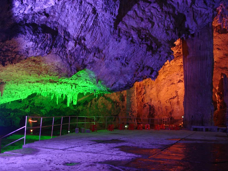 九天洞圖片 九天洞四絕: 第一絕:九天洞大 九天洞總面積250多萬平方米,折合4萬多畝。這樣一個(gè)大溶洞,比堪稱世界第一洞的利川溶洞還大3倍。據(jù)《環(huán)球天然奇觀》一書介紹,南斯拉夫的波斯托伊納大巖洞與美國的巴哈馬大藍(lán)洞,都稱為“世界上最大的洞”,還有古巴的貝拉雅馬爾大巖洞與我國貴州、湖北神農(nóng)架一些溶洞,也都被稱為“世界或中國最大的溶洞”?墒沁@些溶洞,同九天洞比較,都會(huì)感到遜色不少。1988年,中國科學(xué)地質(zhì)研究所巖溶與地下水研究室主任張壽越教授兩次來九天洞考察,他認(rèn)為該洞是亞洲第一大洞,于是他給九天洞題詞:“滴石鑄玄女,暗河鏤九天”。1988年9月下旬,來自美國、英國與比利時(shí)的15位洞穴專家對(duì)九天洞作深入研究,連續(xù)7天7夜住在洞內(nèi)全面考察。通過考察,他們一致認(rèn)為九天洞是世界奇跡,不僅具有很高的旅游價(jià)值,同時(shí)還有很高的科研價(jià)值。