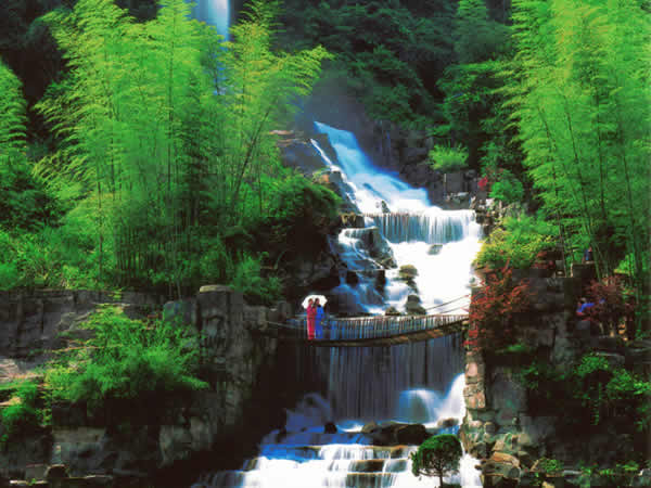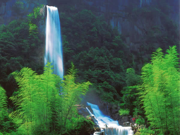 寶峰湖瀑布 湖中有兩座疊翠小島,近岸奇峰屹立,峰回水轉(zhuǎn)。泛舟漫游,只見一湖綠水半湖倒影,充滿詩情畫意。“云梯萬丈上天臺(tái),高峽平湖一鑒開,王母瑤池金扶,浣沙仙女下凡來”游寶峰湖,你就會(huì)欣賞到這樣的詩情畫意。群峰擁抱的寶峰湖,長約2.,5公里,湖猶如一面寶鏡,四面青山,一泓碧水,蕩槳溫游,格外愜意。坐在船上,環(huán)顧四周,千山聳翠,俯視水中,倒影慢移,碧水照相館得群峰綠,人面桃花水映紅。真是靜極了,美極了!韓劇《九天洞》拍攝的湖水就是寶峰湖。