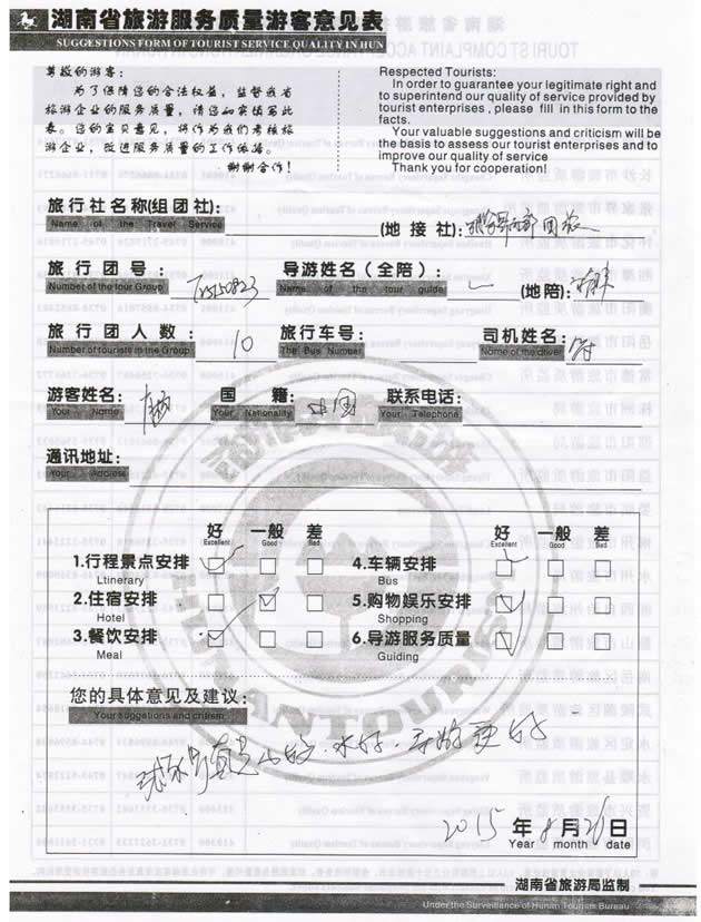 現(xiàn)在位置:首頁(yè) -> 西部國(guó)旅->旅游質(zhì)量反饋 -> 2015-8-23 江蘇肖女士一行10位貴賓 天門山、張家界、天子山、黃龍洞三日游