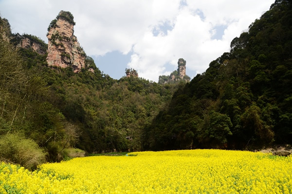 據(jù)了解,這塊“黃金地”位于武陵源十里畫廊景點入口靠近索溪湖尾處,實乃一片沙洲地,景區(qū)居民種植的油菜正是花開季節(jié),猶如黃金灑滿大地。這塊色澤艷麗的“黃金地”,與近處清澈的溪水、嫩綠的水草,以及遠處發(fā)芽的樹木、翠微的峰林一起,構成一幅絕美天然的山水畫,為外界傳遞著武陵源濃濃的春意。