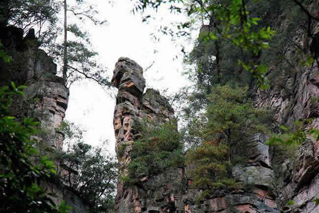 從仙人橋去老屋場,但見深谷里密密麻麻羅列上百座石峰,活像一群威武雄壯的將士列隊聽令,相傳這是向王天子的神兵在聚會。神話雖不可靠,但石峰如此集中壯觀,在武陵源也屬罕見。我想引用一位美術(shù)大師的話:“豈有此理,莫名其妙,說也不信,到此方知”。不看神兵聚會,怎知石峰成林。