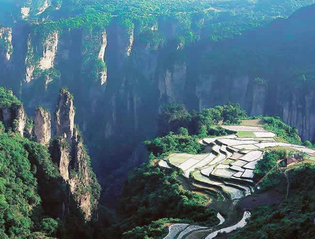 空中田園坐落在天子山莊右側(cè)經(jīng)老虎口、情人路方向兩公里處的土家寨旁,海拔1000余米。它的下面是萬丈深淵的幽空中田園谷,幽谷上有高達數(shù)百米的懸崖峭壁,峭壁上端是一塊有3公頃大的斜坡梯形良田。田園三方峰巒疊翠,林木參天,白云繚繞,活像一幅氣勢磅礴的山水畫。登上“空中田園”。清風拂袖,云霧裹身,如臨仙境,使人有青峰鳴翠鳥,高山響流泉,身在田園里,如上彩云間”之感 。