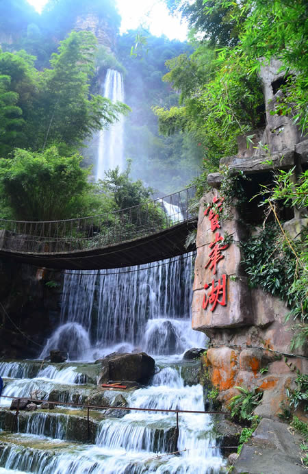 楊家界風景區(qū)東接張家界,北鄰天子山,面積三十四平方公里。楊家界有香芷溪、龍泉峽和百猴谷三個游覽區(qū),其中知名景觀有一步登天、空中走廊、龍泉飛瀑、絕壁藤王、白鶴聚會等二百余處。最高峰“一步登天”海撥1130米。楊家界境內(nèi)溝壑縱橫,溪水長清,植被茂密,森林覆蓋率達95%。