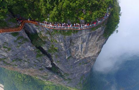 站在棧道上俯瞰群山,古人“會當凌絕頂,一覽眾山小”的感覺油然而生。由于天門山是國家森林公園,植被特別豐富,加上典型的喀斯特地貌,所以,在這條棧道上更能找到一種在乘坐直升飛機飛越熱帶雨林大峽谷的感覺,這平時只能在電影里看到的場景,在這里能讓你身臨其境。