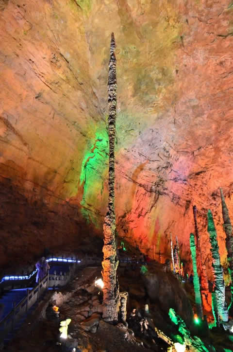 過烏龍泉東行1500米左右,一堵石壁上有一道深4米,高3米,長40多米的凹槽,凹槽上有一直徑約80厘米的洞眼,泉水從中流出。洞內(nèi)有一狹長露天石槽,高10米許,長2000多米,寬僅0.4米,游人進洞,僅可側(cè)行。走完狹槽,復入一洞,高達30多米,寬20余米,長約200米。洞壁、洞頂皆聳立或懸垂著琳瑯滿目的鐘乳石,或大或小,或長或短,淺紅,淡黃,灰白,鐵青,玲現(xiàn)剔透較大的柱狀鐘乳石400多根,均能敲出悅耳的樂音。